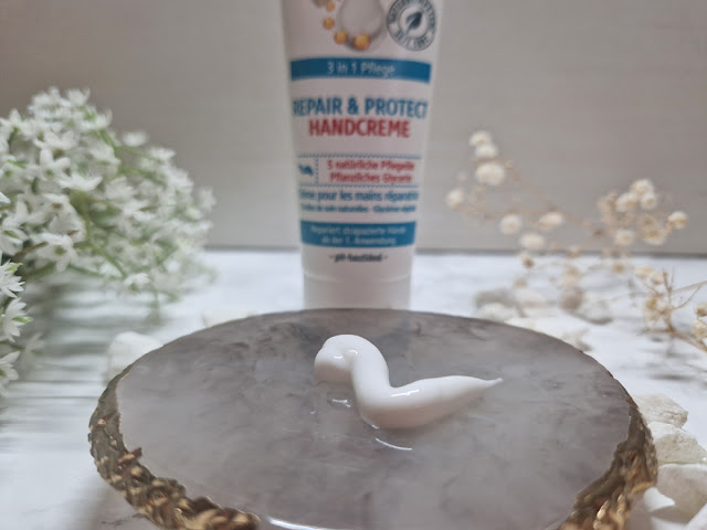 Ich mag diese Handcreme besonders gerne, denn sie hat eine angenehm cremige Textur und lässt sich dadurch richtig gut verteilen. Was mir bei einer Handcreme immer wichtig ist, dass diese schnell in die Haut einzieht und kein klebriges Gefühl hinterlässt und da ist die Repair & Protect Handcreme perfekt.
